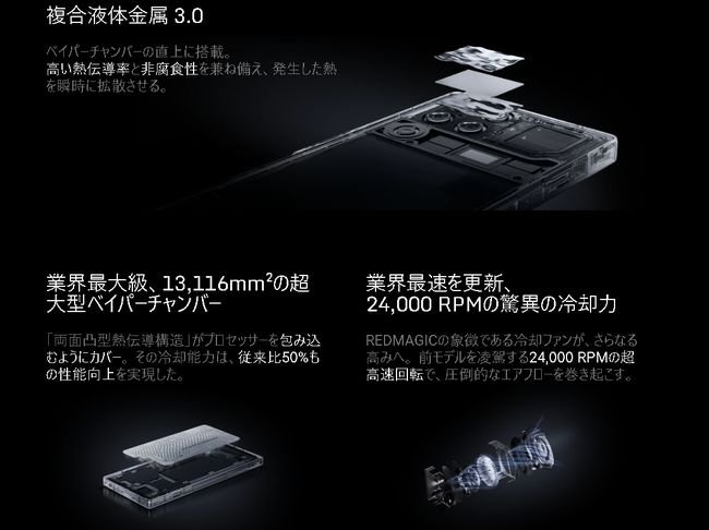 REDMAGIC 11 Pro は Snapdragon 8 Elite Gen 5 を搭載し、大容量 24GB RAM/1TB ストレージまで対応するハイエンドゲーミングスマホ。144Hzディスプレイと革新的な AquaCore 冷却で安定動作を実現し、ゲームも日常利用もハイレベルにこなす仕様です。